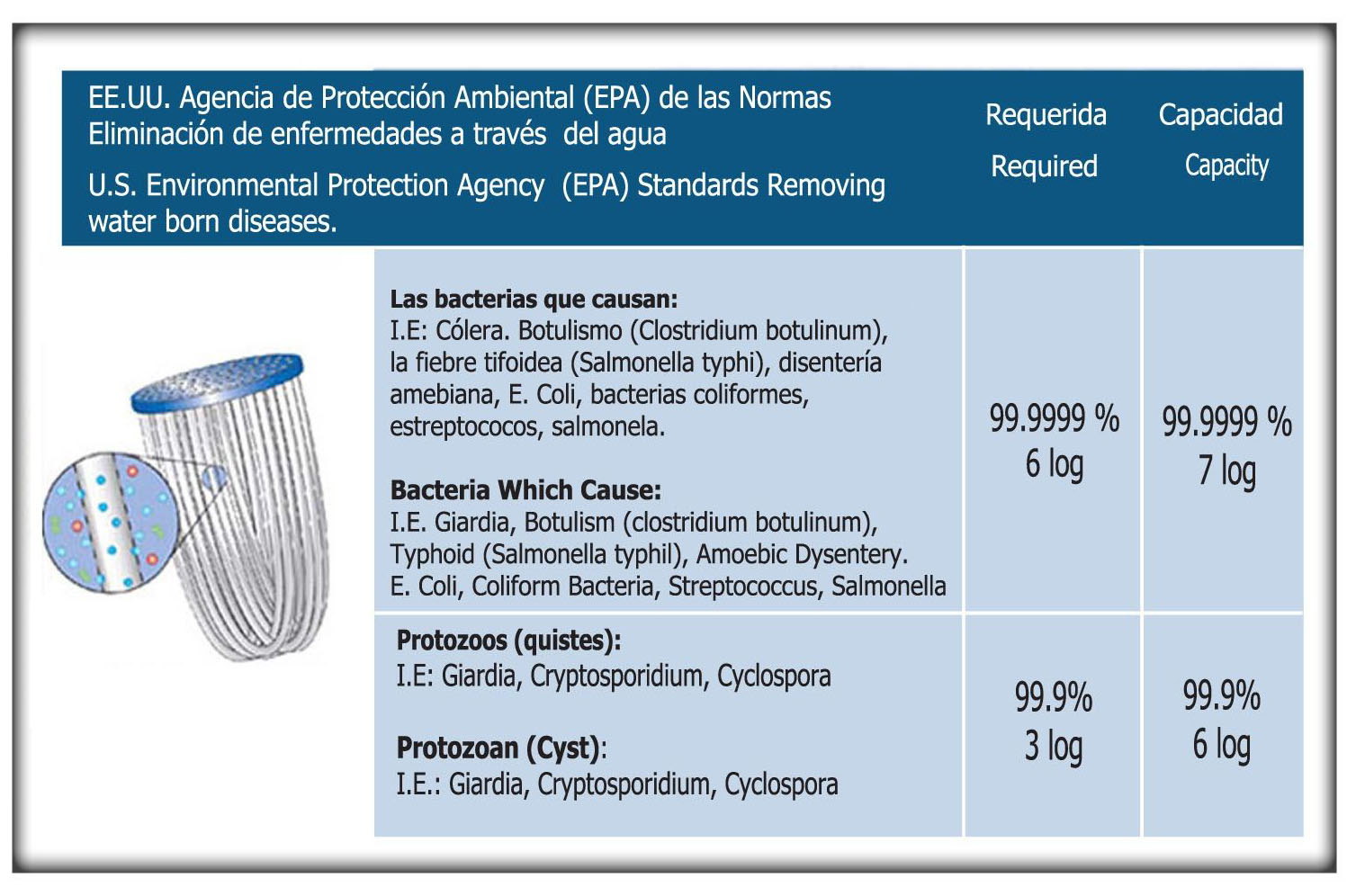 Con 0,1 micras poros nuestros purificadores alcanzan el más alto nivel de purificación existente en la actualidad, superando estándares para el agua potable de la Agencia de Protección Ambiental (EPA) de Los Estados Unidos.